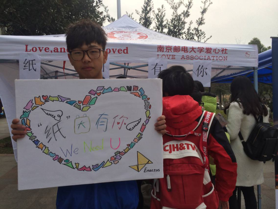 为了给栖霞区福利院的孩子们送去美丽的纸浆画并减轻环保型纸浆厂的运营负担,色情网站 爱心社和色情网站 Enactus创行团队联合举办的环保型公益活动——“纸”因有你,于2015年12月11日在南二外场正式拉开帷幕。