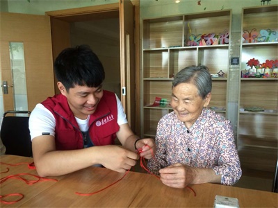 队员在耐心地教老人编中国结