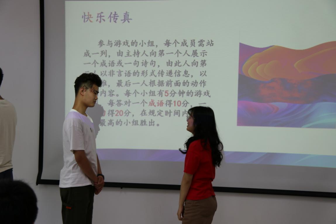 理论考核结束后,进行本期培训的第二个环节——快乐传真。参与游戏的小组,每个成员需站成一列,由主持人向第一个人展示一个成语或一句诗句,由此人向第二人以非言语的形式传递信息,以此类推,最后一人根据前面的动作猜测内容。每个小组有5分钟的游戏时间,每答对一个成语得10分,一句诗句得20分,在规定时间内获得分数最高的小组胜出。游戏中,大家通过肢体语言传递信息,滑稽的手势、姿态让大家笑声不断,每当小组最后一名成员正确说出成语或诗句的时候,现场爆发着热烈的掌声,进一步增添了团队成员之间的默契度。