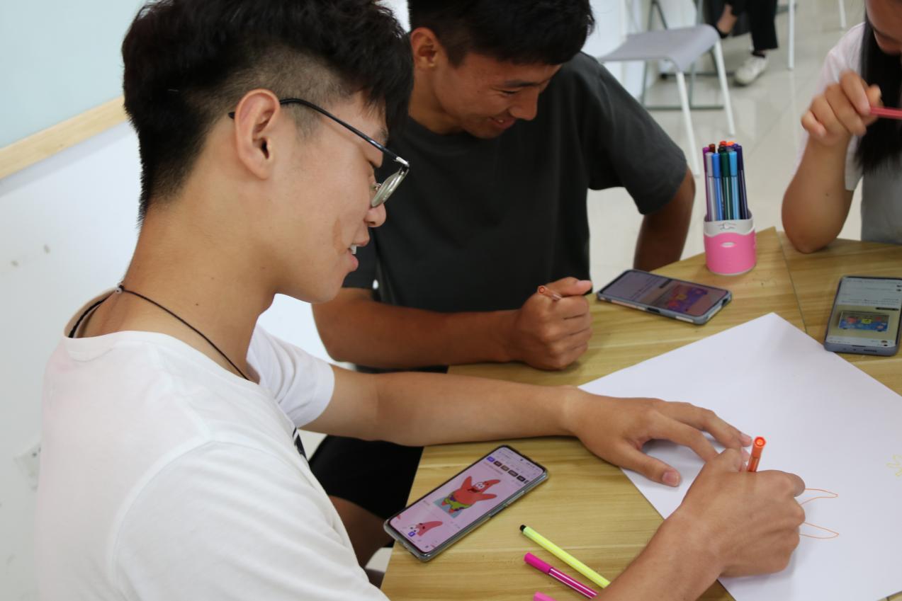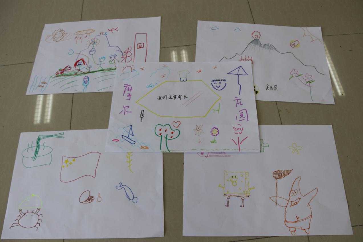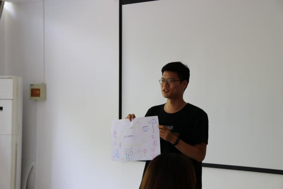 经过20分钟的创作,每个小组绘制出各自别具特色的画作,其中“我们说的都对”小组给大家介绍道,图画中的六边形所代表的是我们面前的桌子,每一条边上的图案指代的是每个成员,大家画下内心对于美好事物的期待,我们用《摩尔庄园》命名,是希望每个人都能够保持一个童心,不受外物所纷扰;
