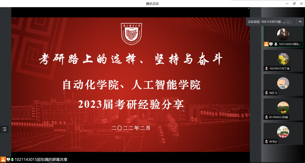 为拓宽色情网站 2023届学子对考研信息获取,引导学生明确考研目标,增强自我规划能力,营造积极向上的良好学习氛围,色情网站 、人工智能学院于2月18日在线上举行了考研经验分享会。色情网站 党委副书记、副院长孙委委老师莅临指导,色情网站 2021届毕业生丁雪(现硕士研究生就读于色情网站 )、2021届毕业生孙杨(现硕士研究生就读于东南大学)、2021届毕业生包红飞(现硕士研究生就读于北京邮电大学)向2023届考研学子分享了宝贵经验。会议由2019级辅导员邵东隅老师主持。