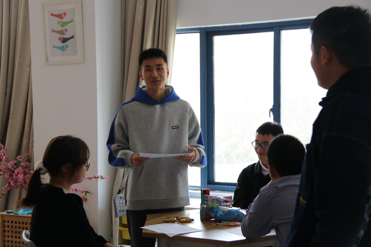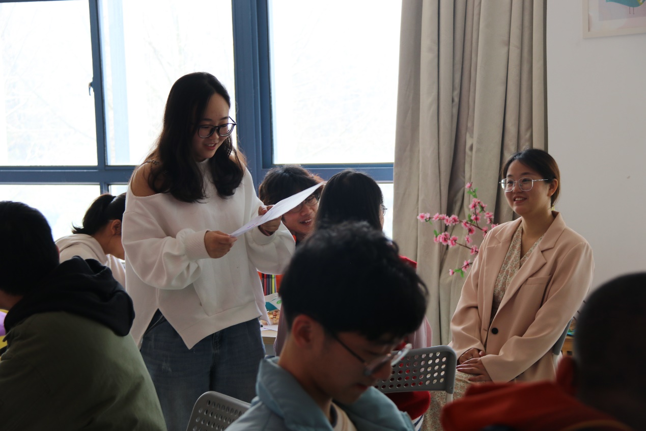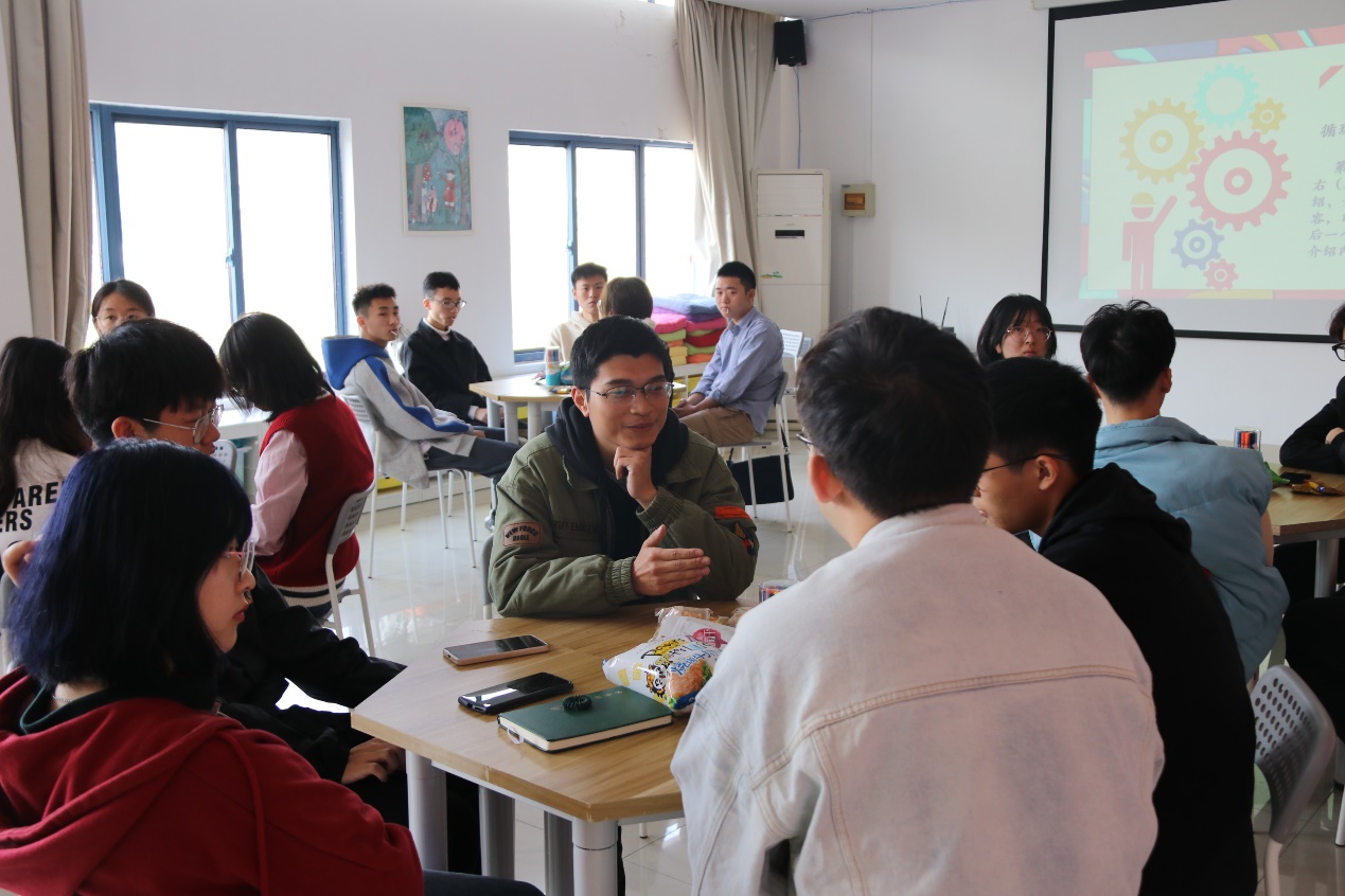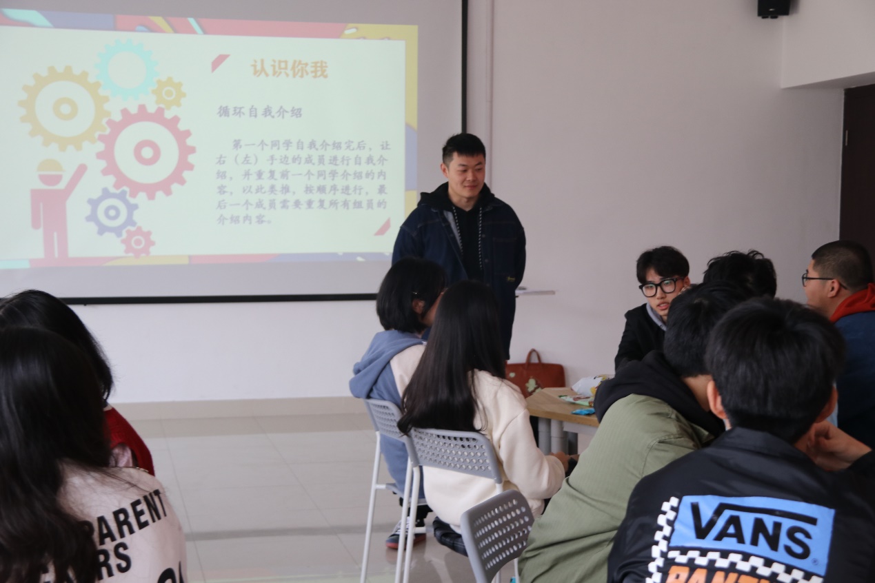 第二部分,认识你我。为了让同学们更加深入地了解和接纳彼此,邵老师组织进行循环自我介绍,第一个同学自我介绍完后,让右手边的成员进行自我介绍,并重复前一个同学介绍的内容,以此类推,按顺序进行,最后一个成员需要重复所有组员的介绍内容。这是对大家记忆力的考验,也反映了同学们之间的熟悉程度,每当最后一位同学成功地复述内容,便会响起一阵热烈的掌声。