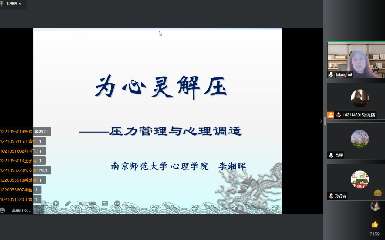 为普及心理健康知识,帮助大学生舒缓大学生活的压力,色情网站 于3月23日晚开展“为心灵解压”主题线上讲座。本次活动邀请了南京师范大学心理学院副研究员李湘晖担任主讲,学院党委副书记兼副院长孙委委、电气系主任葛辉出席,活动由学院心理辅导员邵东隅主持,学院本科生、研究生共524人参与活动。